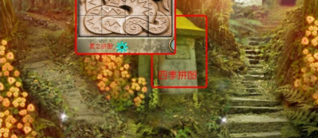 进入场景【1】,得到打火石,并记录墙上的标记。往右进入【3】,依据【1】石壁上的标记打开石门。进入【4】,将绿色的春之宝石放入春之神像中,再按下代表春天的绿叶按钮,季节转换为春天。进入到蛇环路口【5】,往右行到【9】,上树到【10】,取到绳子,下树。前行到【12】,在树洞中得到石塞子。前行到【15】狮头雕像神坛,往右行经【16】、【22】到达【25】,得到撬棍。返回【15】狮头雕像神坛,前行进入【21】。用撬棍撬开地上石板,拿到一块方形地砖。返回【15】狮头雕像神坛,往左到【14】,将方形地砖放入缺失处,完成一个拼图,得到一条皮带。右行经【15】【16】【22】,到达【24】,将皮带安装到齿轮上,石门打开。进入石门到【28】,右面得到宝石,上面记录标记。再到【21】,将宝石放入木门的凹槽处,木门打开。进入木门,是四季拼图【23】。完成四季拼图的第一个:春之拼图。