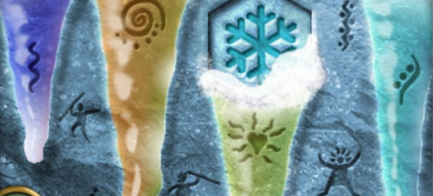 左行到【26】,采摘到红色的春之花,左面有藤蔓挡道。左行到【30】,将绳子拴在铁环上。顺绳子到岩洞【31】,捡到一块碎石板,用撬棍撬开石壁,得到一把铜狮钥匙。到【27】铜锁石狮雕像处,使用铜狮钥匙,雕像底座升起,得到弹弓。每打开一个石狮机关,对应的狮头雕像神坛【15】的狮子眼睛就会发光。到达【13】,地面有流沙坑阻路。使用弹弓打树上的圆形靶子,流沙中升起一行石板可通行,还有一个日晷石柱,穿过石板路进入石屋【18】,右面得到砍刀,中间解开宝箱的密锁,取到蓝色的冬之宝石。原路返回到【26】,用砍刀三刀砍掉藤蔓。前行是【32】,往左上台阶到冬之神像【35】,将蓝色的冬之宝石放入冬之神像中,再按下代表冬天的雪花按钮,季节转换为冬天。下行到四季拼图【23】,完成四季拼图的第二个:冬之拼图。