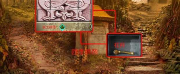 到【40】,用撬棍打开石棺,得到望远镜和一枚铜钱。到银锁石狮【41】,将望远镜放于托架,看到远处石塔一侧的标记并记录。到【19】,用打火石点燃木材堆。树到【10】,将望远镜放于托架,看到远处石塔另一侧的标记并记录。下树到蛇环路口【5】,依据望远镜看到的石塔上的标记,转动蛇环,得到金色蛇环。【6】,将绳子拴在井上方的树干,顺着绳子爬到井底,在井底【7】,捡起地上的发光的银盘,将金色蛇环放入墙壁的圆圈内,石门开启,并记录蛇环上的标记。进入刚刚开启的石门,得到一把生锈的钥匙。返回地面(绳子就留在树干上,还得下去,别处也用不着)。到春之神像【4】,将季节转换为春天。返回,从蛇环路口【5】往左到【19】(路程最近)。压动压水井手柄,将火熄灭(只有在春天才能压出水),得到木炭。到【22】,发现水槽中满水,并漂起一个宝箱,用在井里得到的钥匙打开宝箱,得到橙色的秋之宝石。【40】,将木炭涂抹在石壁不清楚的标记上并记录。【42】,将将橙色的秋之宝石放入秋之神像中,再按下代表秋天的枫叶按钮,季节转换为秋天。【23】,完成四季拼图的第四个(最后一个):秋之拼图。
