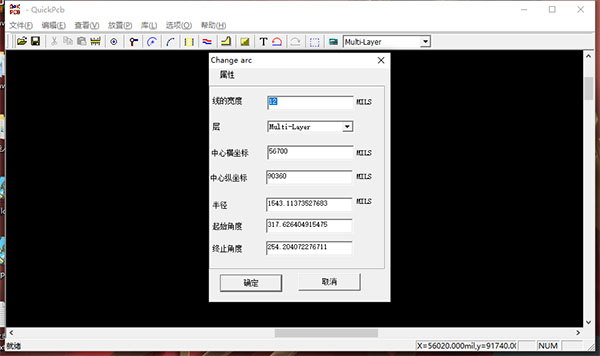 4、双击图形就弹出属性设置界面,编辑线的宽度、层、中心横坐标、中心纵坐标、半径、起始角度、终止角度