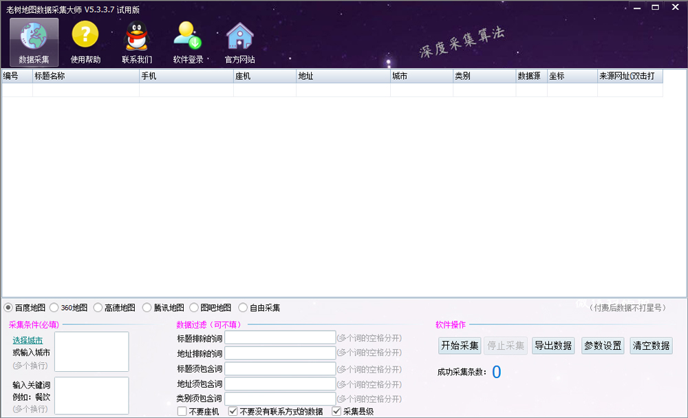 老树地图数据采集大师是一款基于地图定位的数据采集软件,适用于各类中小型企业与个人数据分析,支持目前所有类型的运行环境,而且能根据百度地图,腾讯地图和搜狗地图的数据做到精准定位,保证了数据来源的可靠性。