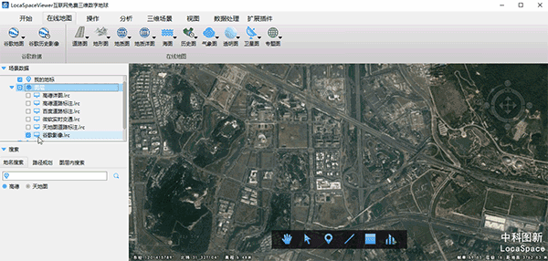 LSV的能够加载各种类型的数据(包括KML、SHP、CAD等格式的矢量;TIF、IMG、MBT、Lrp等格式的栅格数据;tif、img、hgt、dem等的DEM数据;osgb的倾斜实景数据;obj、3ds的人工模型数据等),具体的可加载类型会在4.2(本地数据)中详细说明。可以通过菜单栏中的加载或者直接拖拽的方式加载数据。
