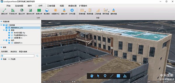 LSV中有三维模型进行分析的工具,方便又高效,可以通过其对三维模型进行分析操作。具体详情在7(分析)中会进行详细说明,以下图例为三角测量以及空间面积测量: