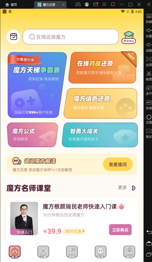 魔方还原电脑版是一款借助模拟器在电脑上运行的魔方教学工具,该软件适用群体广泛,不管是魔方初级爱好者,还是魔方高手玩家,都可以从这个软件中学习到关于魔方各自玩法的新知识。尤其是在魔方的还原上,魔方还原软件可以通过扫码实体魔方后,为魔方玩家们提供各种还原思路,以及为用户提供各种高阶的还原方法,让用户按照软件中给出的步骤一步步地有技巧性地快速还原手中的魔方。