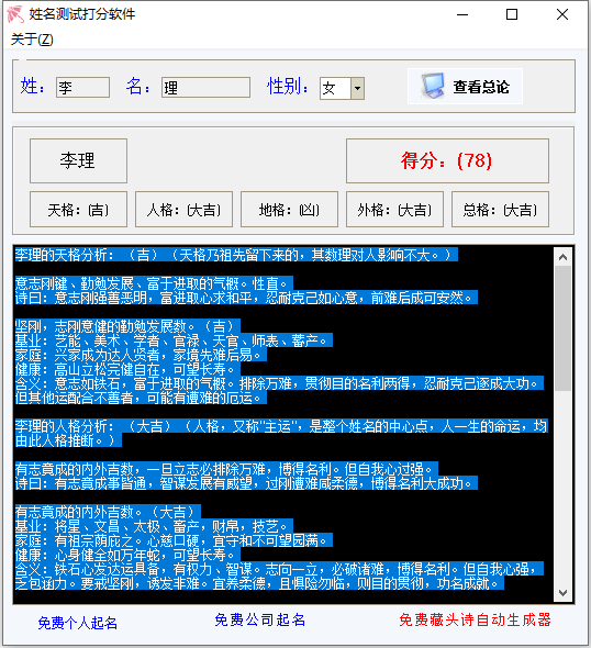 1、提供了姓名打分,五行格局图,姓名四大格局的精确分析,让你全方位了解你的姓名本身具有的涵义。