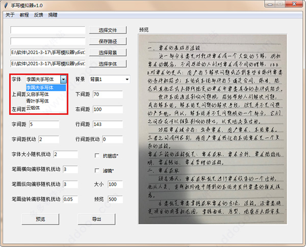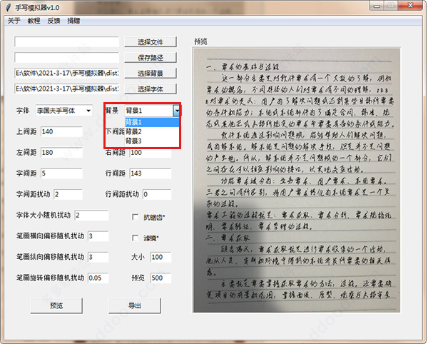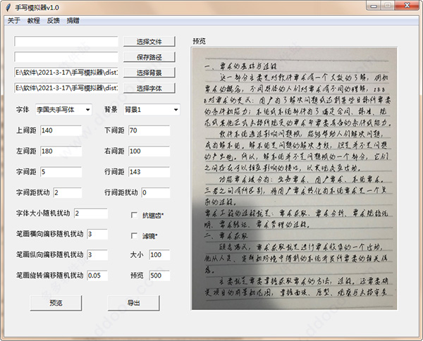 手写模拟器demo是一款体积轻量、简单易用的文字转换软件,用户可以将Word文件内的文本内容转换为手写的文字图片,用户只需将本地的文档文件添加到软件上,设置好存储路径即可把文字转换成手写模拟图片,非常方便好用。软件支持自由选择字体、背景以及字间距功能,还可对字体大小随机扰动、画笔横纵扰动等参数自定义设置,可以让用户进行灵活便捷的文字转换手写模拟图片。此外,手写模拟器支持文档内容预览和导出功能,可让用户有选择性的进行文档转换和导出转换后的图片进行保存,有需要的用户可以下载使用。