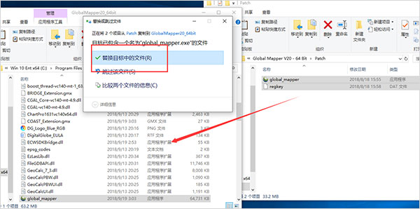 7、现在已经成功破解啦,但软件还是默认英文语言,这时,打开global mapper 20汉化包文件夹,将global_mapper.exe复制到软件安装目录下进行替换;