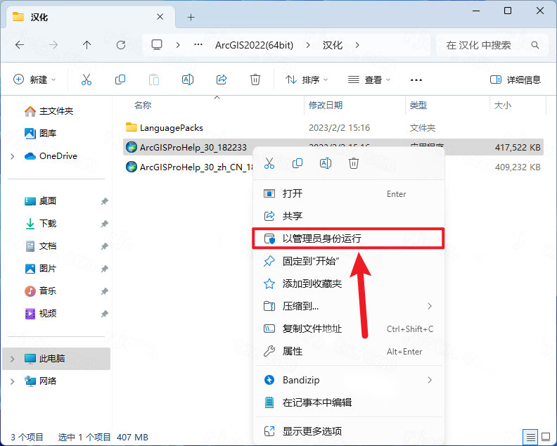 17、再回到文件夹,双击打开【汉化】文件夹,安装中文帮助,鼠标右击【ArcGISProHelp_30_182233】选择【以管理员身份运行】