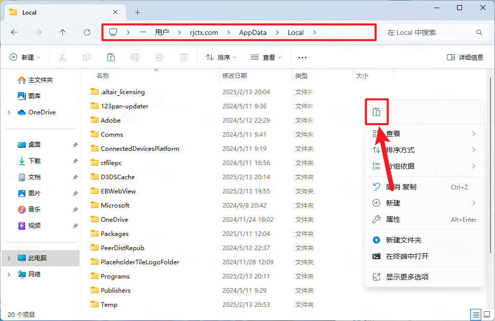27、依次打开路径:C:\Users(或用户)\不同电脑显示不同\AppData\Local,鼠标右击空白处选择【粘贴】
