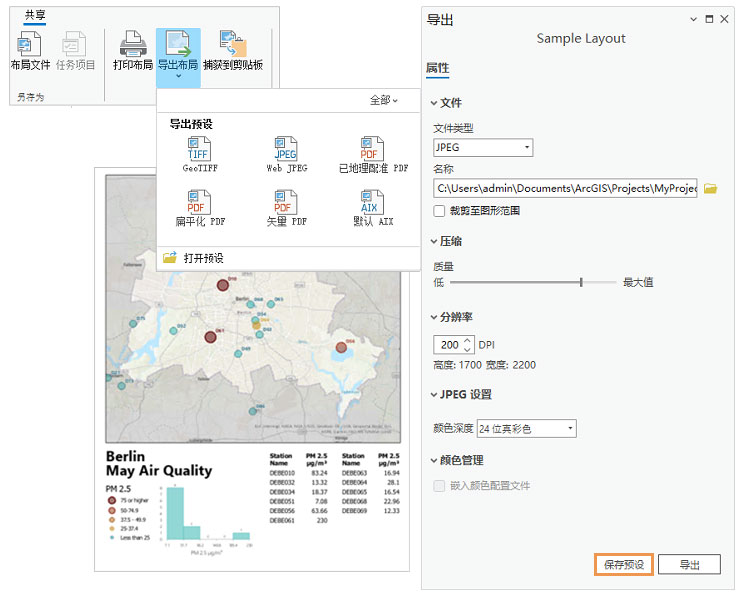您可以在 ArcGIS Pro 中为地图和布局创建导出预设。 导出预设将保存特定导出类型的所有设置。 导出地图或布局时,您可以选择默认预设或您创建的自定义预设。 这有助于实现更加快速、一致的导出体验。