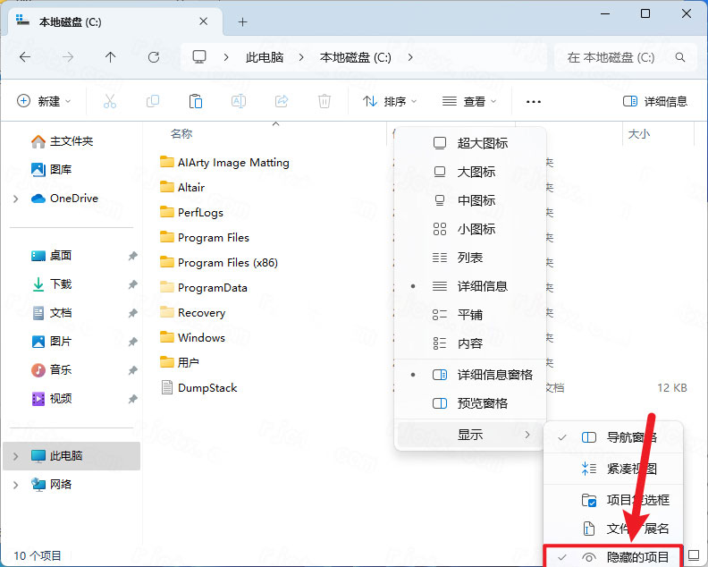 26、打开电脑C盘,点击菜单栏中的【查看】,点击【显示】,点击【隐藏的项目】