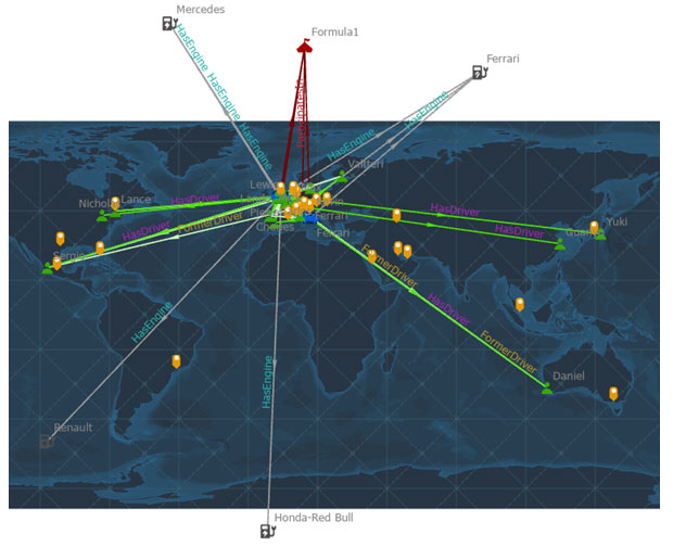 新增了一个可用于链接图表的地理布局。 链接图表中的实体将使用其空间几何定位在地图上。 还可将空间数据添加到链接图表中,并可使用底图为知识图谱的空间实体提供上下文。