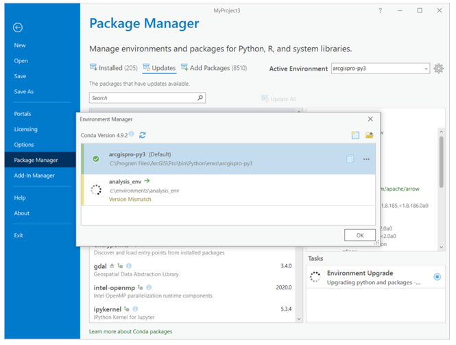 包管理器页面允许您管理在 ArcGIS Pro 中使用的 conda 环境。 先前被标识为 Python 页面的包管理器页面现在支持将您在先前版本的 ArcGIS Pro 中创建的 conda 环境升级到当前版本、修复损坏的环境以及重命名现有环境。