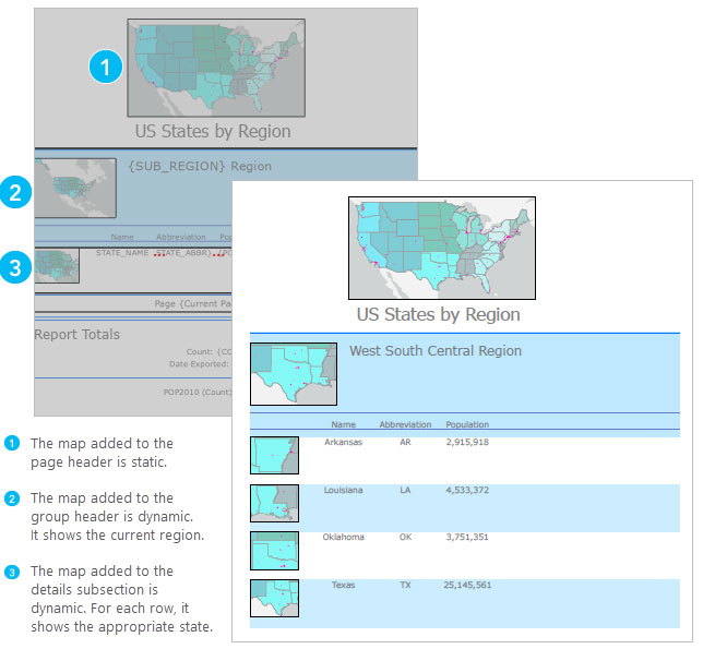 您现在可以将地图添加到报告中。 添加到报表页眉或页脚的地图为静态地图。 您可以激活地图框以调整地图范围或比例。 您添加到组页眉、组页脚或详细信息小节的地图为动态地图。 在报表视图中,无法激活动态地图的地图框;但是,导出的结果会更新比例和范围,以反映该小节中包含的一个或多个要素。
