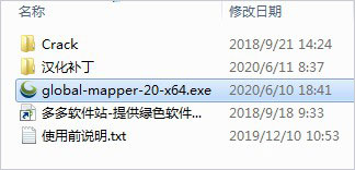 1、首先在本站下载解压,得到global mapper 20软件包,global mapper 20汉化补丁和Crack文件夹;