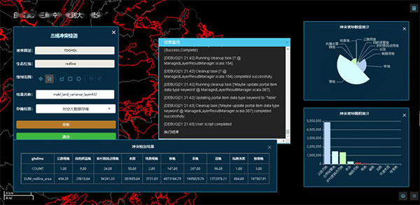 2、基于Runpython 接口模型构建 在自然资源大数据分析中,三线冲突检测是一个常用的业务场景,涉及到土地利用规划数据、生态红线数据、城市发展边界数据的叠加分析和报表统计。利用Runpython 重构传统业务模型,在服务器端完成全部复杂计算,前端进行参数传递和结果呈现,极大提升了模型计算效率和系统集成效率。