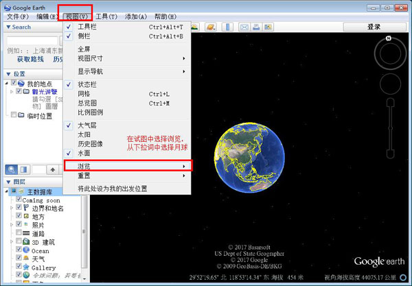 1、点击“在地球、太空和其他星球之间切换”快捷功能后,选择月球选项,软件就会自动载入月球图像。按住左键拖动鼠标即可移动地图,而按住右键后上下移动鼠标即可控制地图的缩小和放大,左右移动鼠标即可控制地图的旋转。