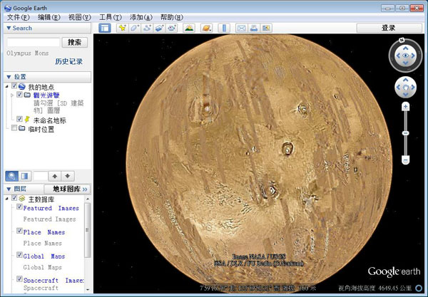 5、点击工具栏上的“星球”图标,选择下拉菜单的第3个【火星】,可以浏览火星。