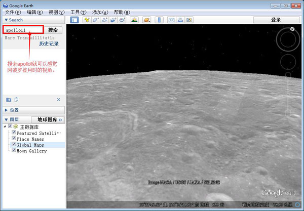2、进入月球地图之后,可以直接在文件栏下面的搜索窗口内输入“apollo11”,然后按搜索按钮,系统就会自动将你的视角带入阿波罗11号登月的方位,你只需控制鼠标的左右键即可放大缩小和调节自己的视角。