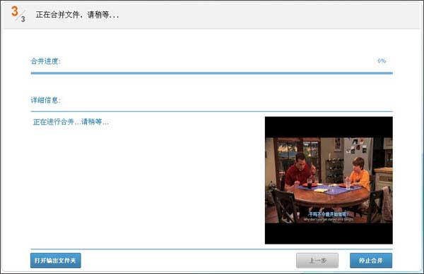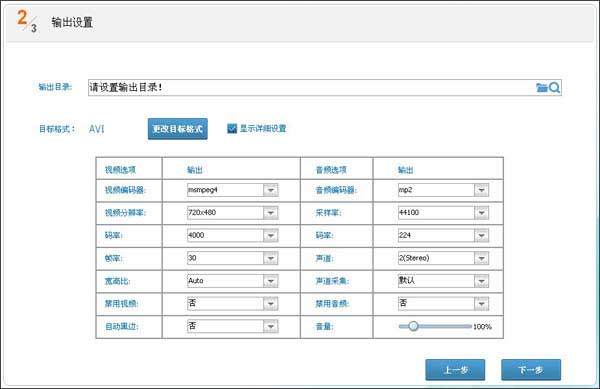 2、进入输出设置页面,点击【更改目标格式】设置输出的格式,可以根据需要设下“视频分辨率”和“码率”,其他一般不需要进行设置。完成后直接点击下一步开始视频合并。