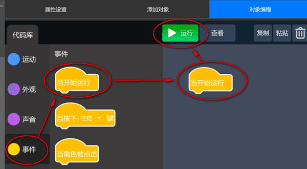 5、在【事件】模块中,选择【当开始运行】积木语句,拖拽至编程区,作为程序指令的开始。