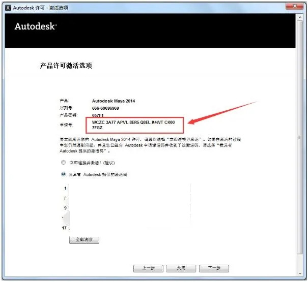 10、最后复制Activation中的激活码至“输入激活码”栏中,并点击下一步完成激活。