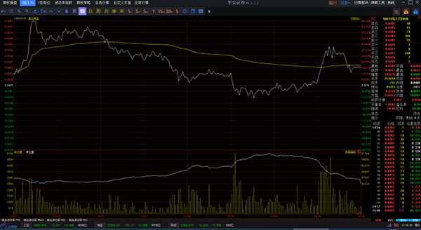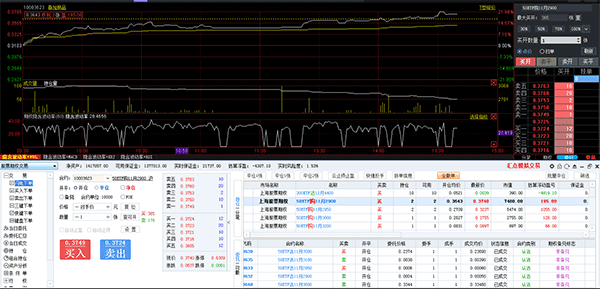 3、在【T报主力】页面中,双击某期权合约报价所在行,就会调入该合约的分时走势画面;在【T型报价】页面中,双击某期权合约报价所在行,就会调入该合约的分时走势画面;在【期权行情报表】页面中,双击期权合约报价列表中的某一期权合约,就会调入该合约的分时走势画面;在【正股关联】页面中,双击主窗口左上角期权合约报价列表中的某一期权合约,就会在当前页面调入该合约的分时图或K线图,可通过回车键或工具栏按钮来回切换。登录期权交易后,在股票期权分时图上,如合约有持仓,则会出现黄色虚线的“持仓线”,是此合约买入持仓(权利)或者卖出持仓(义务)平均成本价,另有显示持仓盈亏金额。