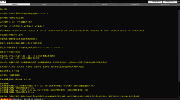 5、直接按键盘上的F10可以查看当前品种合约、期权简介、交割方式、期权术语、风险指标说明等详细信息