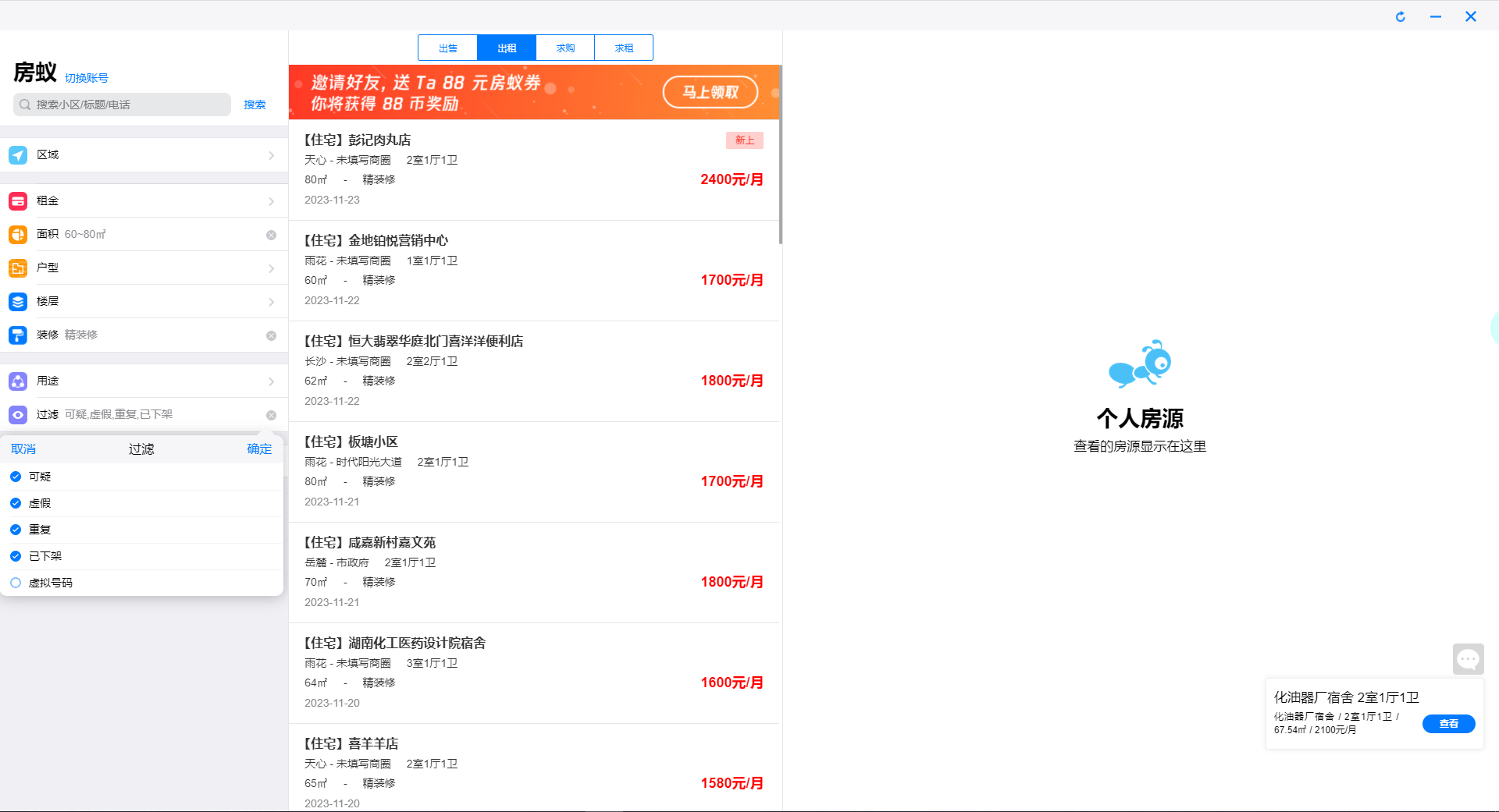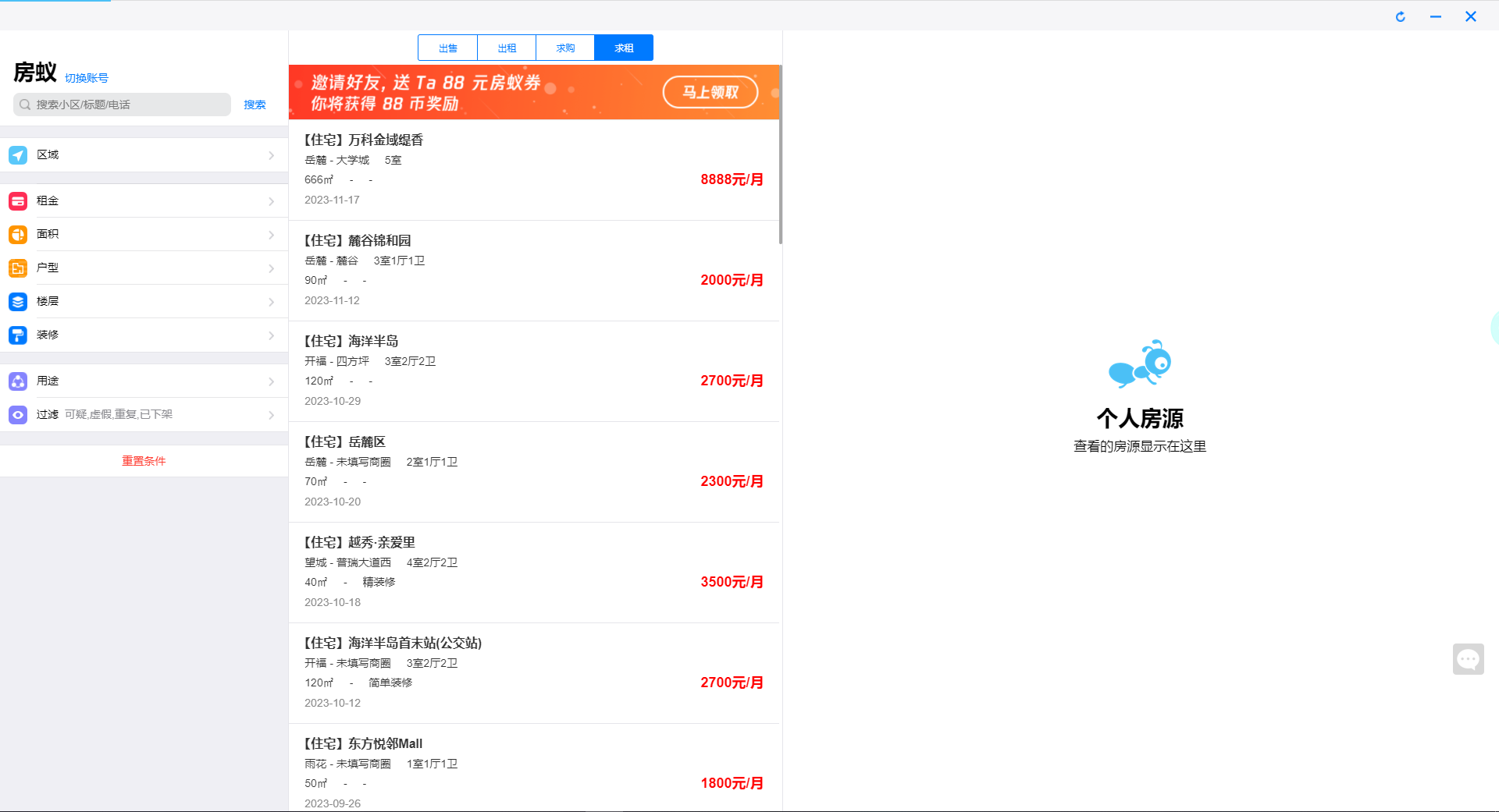8、我们可以通过左边的区域、租金、面积、户型、楼层、装修、用途和过滤选项进行条件筛选,匹配更加合适的房源,