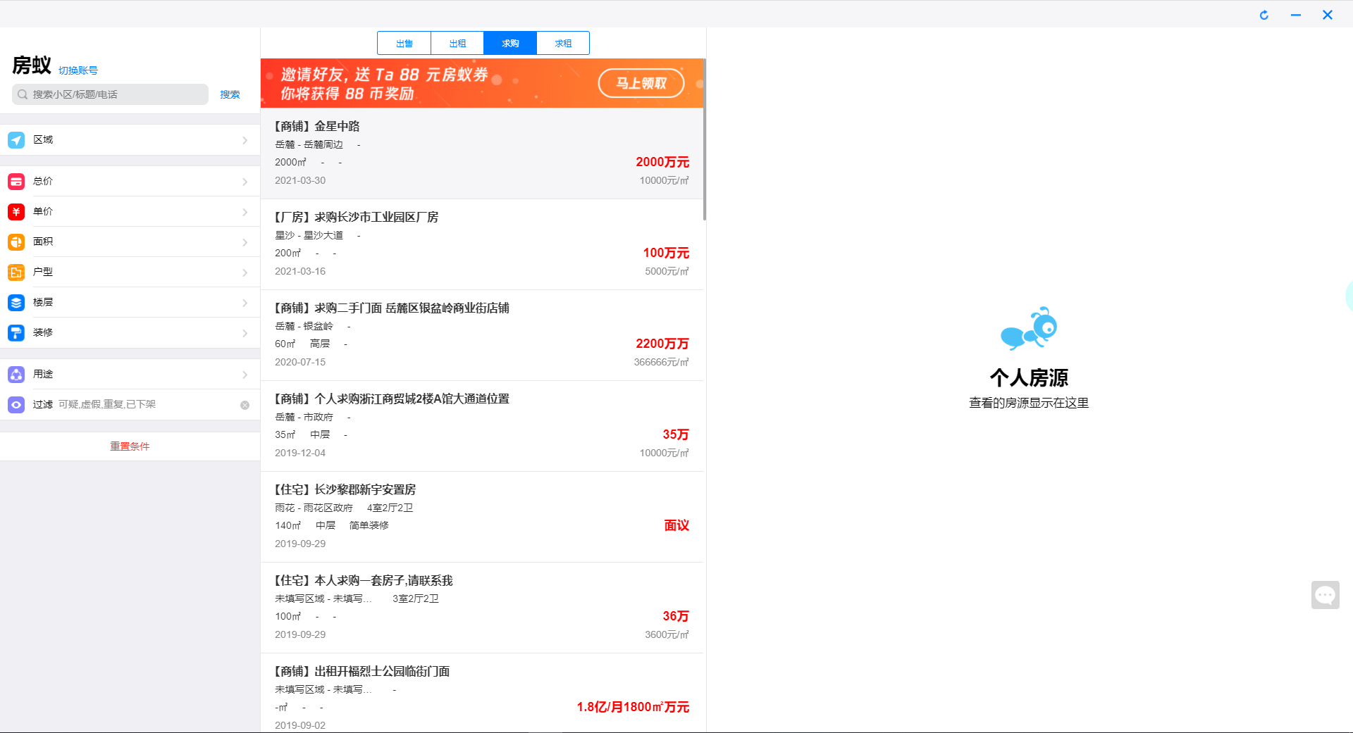 6、进入【求购】界面,可看到个人用户求购的商铺、住宅、厂房等相关信息,