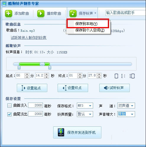 6、完成所有设置后,即可输出铃声。点击“保存铃声”——“保存到本地”,选择合适的存放位置。这样属于自己的铃声就轻松完成了。
