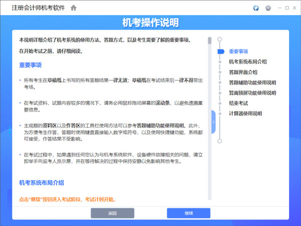 5、在正式开考之前,用户请仔细阅读,阅读完之后再点击继续进行考试阶段;