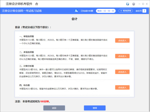 1、打开注册会计师模拟考试系统,可看到有会计、审计、财务成本管理、经济法、税法以及公司战略与风险管理这6个科目的考试试题;