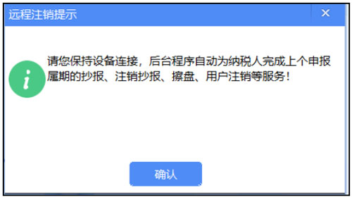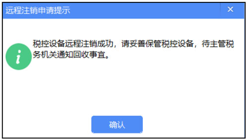 【第四步】点击 “确认”按钮,开票软件自动检测金税盘远程注销条件,检测通过后系统向税局端发起查询远程注销金税设备的申请,注销成功后提示“税控设备远程注销成功,请妥善保管税控设备,待主管税务机关通知回收事宜。”