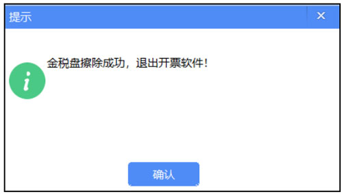 【第五步】点击“确认”按钮,提示“金税盘擦除成功,退出开票软件!”