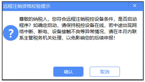 【第二步】点击“确认”按钮,税局端对本纳税人进行注销资格校验,校验通过,提示“尊敬的纳税人,您符合远程注销税控设备条件,是否启动程序?如确定启动,请保持税控设备在线,若中途出现网络中断、断电、设备接触不良等异常情况,请在本月内联系主管税务机关处理,以免影响您的后续申报!”
