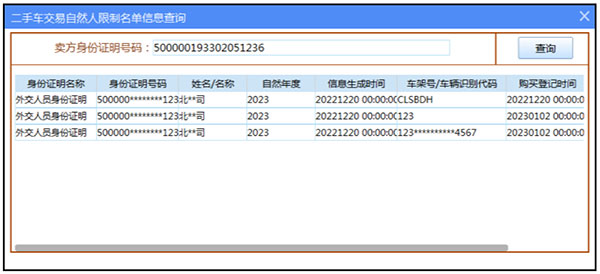 点击“查看详情”,可查询到所输入“单位代码/身份证号码”在局端限制二手车交易自然人信息中的内容,