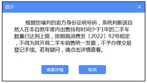 1、开具二手车销售统一发票票面信息时,若录入的“单位代码/身份证号码”在“自然人限制名单”中,则开票软件阻断填开二手车发票,并弹窗提示“根据您填列的卖方身份证明号码,系统判断该自然人在本自然年度内出售持有时间少于 1 年的二手车数量已达到上限,按照商消费发〔2022〕92 号规定,不得为其开具二手车销售统一发票,不予办理交易登记手续。