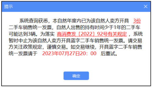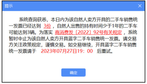 3、卖方不在“自然人限制名单”和“暂时性阻断开票名单”内,但是所开发票不是“暂时性阻断期”后的第一张蓝字发票,但在“预警名单”中,提示“系统查询获悉,本自然年度内已为该自然人卖方开具*份二手车销售统一发票,自然人出售的持有时间少于1 年的二手车可能达到 3 辆。为落实商消费发〔2022〕92 号有关规定,系统暂时中止为该自然人卖方开具蓝字二手车销售统一发票。请交易方关注政策规定,谨慎交易。如交易继续,开具蓝字二手车销售统一发票请于××××年××月××日××:00 后重试。”