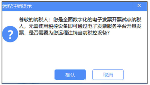 【第一步】符合资格条件的试点纳税人插入金税盘,联网登录开票软件,系统自动查询纳税人是否具备远程注销税控设备资格。如具有远程注销资格,提示“尊敬的纳税人:您是全面数字化的电子发票开票试点纳税人,无需使用税控设备即可通过电子发票服务平台开具发票,是否需要为您远程注销当前税控设备?”