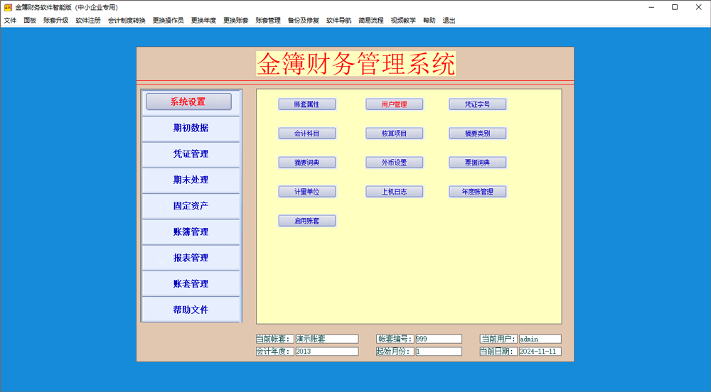 每个账套下可建多个年度账,具体数量视硬盘容量,这样便于数据管理和查询,同时可方便地引入引出。