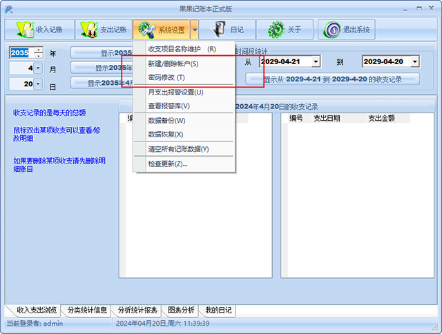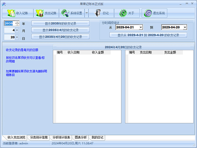 4、自动分析年、月、日收入及支出的比重,并分类统计收支图形展示及年、月、日季报表输出打印。