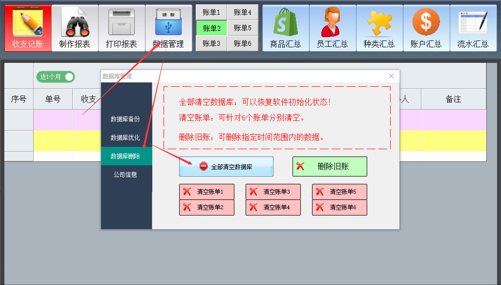 答:点击【数据管理】,点击【数据库删除】,点击【全部清空数据库】