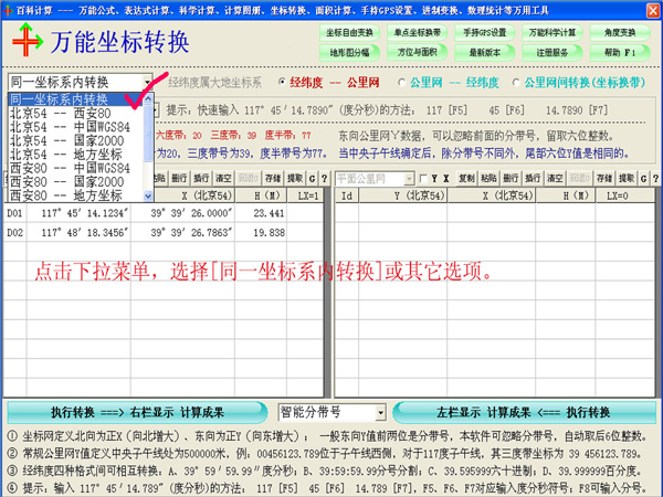 1、打开已完成安装的万能坐标转换器软件后,点击下拉菜单中的同一坐标系内转换。
