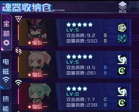 魂器收纳仓就是存放魂器的仓库,你也可以把他理解成已有魂器的图鉴库。进入魂器收纳仓可以直观的看到各个魂器的攻击资质和血量资质,最高的是S,最低的是C。还有魂器的等级和星级,如果你的魂器很多的话,可以点击左边的特性分类,或者是右上方的筛选功能,都是很方便的分类功能。