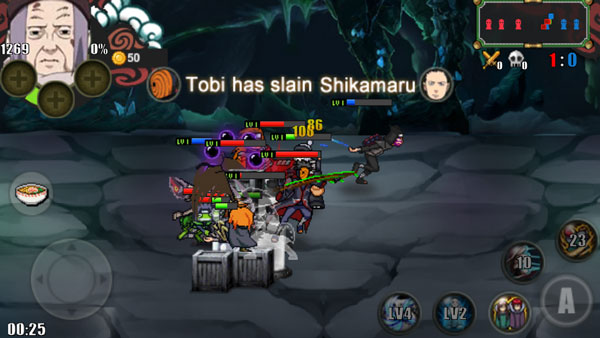 同时游戏中数十多个不同的经典忍者角色真实还原,每个人物都有着专属的技能连招、必杀技,并且你还可以通过击败敌人获取金币来购买道具装备,每个装备都会带给角色不同的效果,带给玩家别具一格的游戏体验。在玩法上,火影战记采用了推塔作战的玩法,玩家在游戏中有两名队友,三名对手,这些都是系统随机选定的,你需要打败所有对手,并且破坏三座防御塔才能取得最终的胜利哦。
