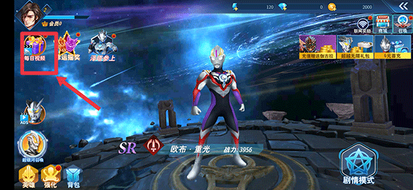 1、打开奥特曼格斗超人,在游戏首界面中,点击左上角的每日视频;