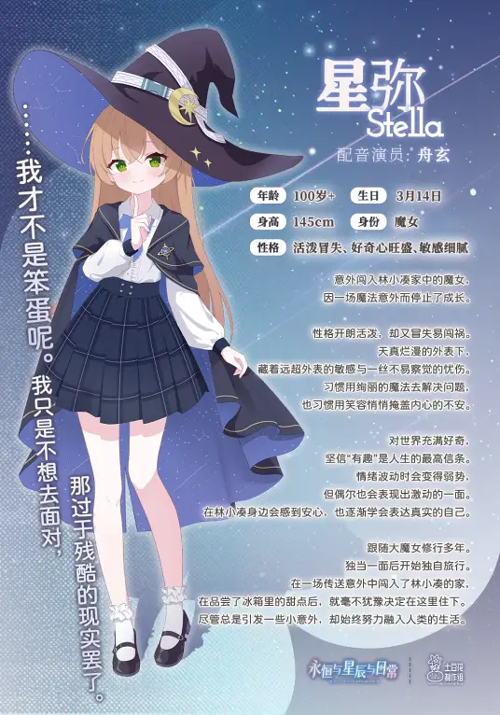 意外闯入林小凑家中的魔女,因一场魔法意外而停止了成长。跟随大魔女修行多年,独当一面后开始独自旅行。在一场传送意外中闯入了林小凑的家,在品尝了冰箱里的甜点后,就毫不犹豫决定在这里住下。尽管总是引发一些小意外,却始终努力融入人类的生活。