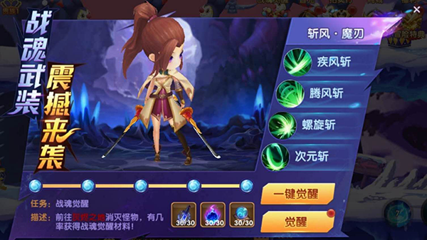 5、完成上述的挑战后,得到认可的冒险家将能得到使用战神之力的资格,通过收集战魂碎片(目前可获得的战魂:斩风·魔刃、炽焱·1-17),即可随时切换形态,重塑战神之力,利用战魂独有的技能高效战斗。