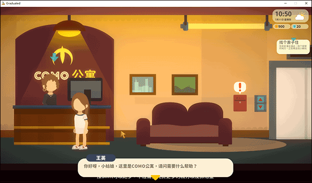 9、现在,玩家可以来到一处公寓点击E键进入,和公寓管理员进行对话了解房屋情况;